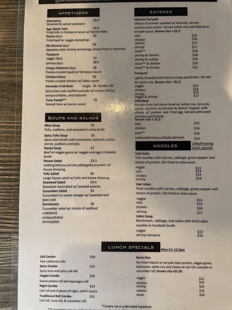 Additionally, with happy hour specials and a full bar, Sumo Sushi and Seafood stands out as a fantastic spot for lunch, dinner, or any special gathering. Come indulge in an unforgettable culinary experience!
